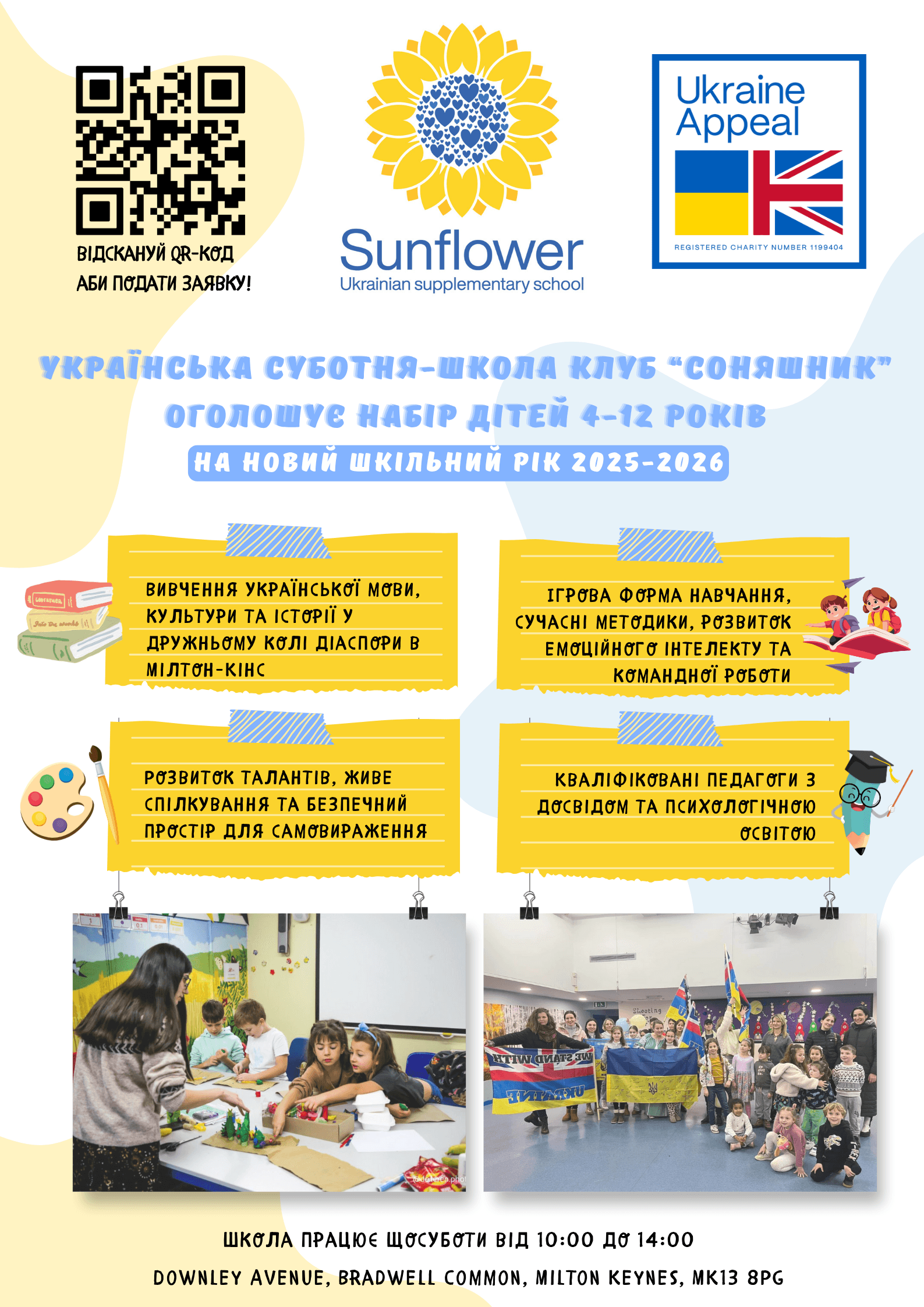 Українська суботня школа-клуб «Соняшник» оголошує набір учнів від 4 до 12 років на новий шкільний рік 2025-2026.